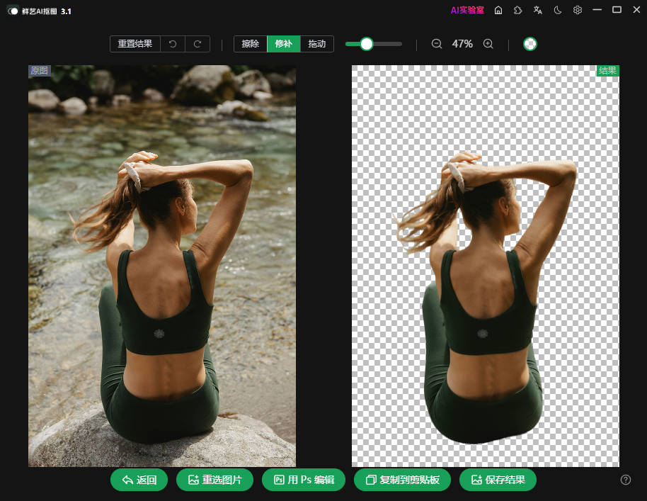 - 实用功能一应俱全:批量抠图可自动识别文件夹及子文件夹内所有支持图片,轻松搞定海量素材;默认开启的自动裁切透明像素、自动复制抠图结果到剪贴板功能(均支持设置关闭),进一步提升操作效率。此外,软件还支持二次编辑,可擦除多余部分、修改背景色,也能生成.psd 文件调用 Photoshop 精细编辑;毫秒级 AI 擦除功能搭配可复用绘制模板,让修改更便捷