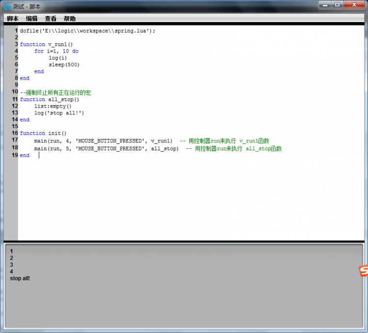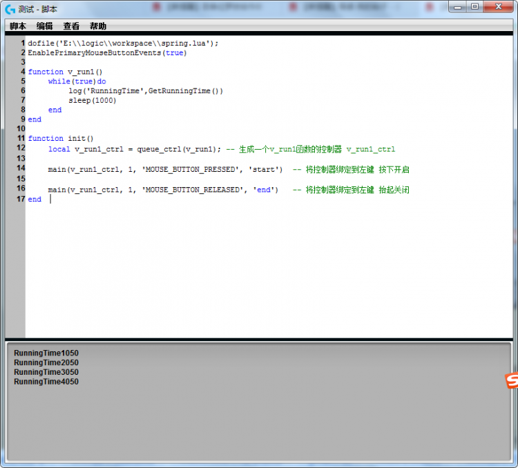 如图,实现了按下鼠标左键运行v_run1宏,输出系统运行时间。抬起鼠标左键停止输出。