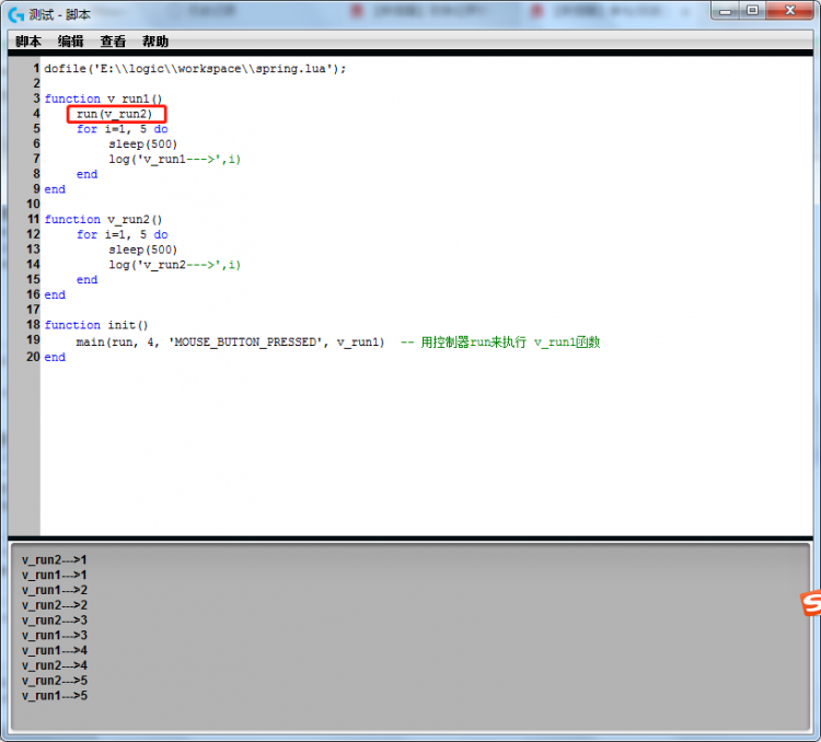 如图,在v_run1中用run函数调用v_run2方法。