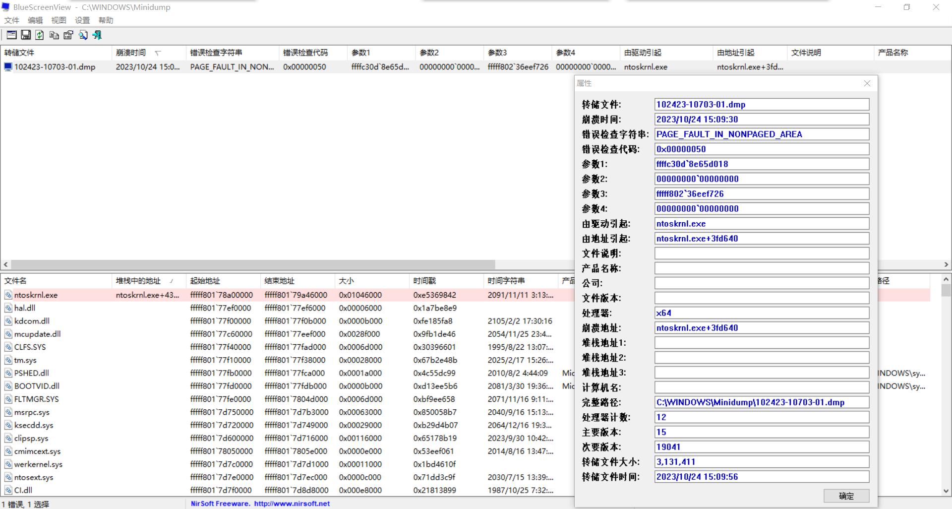 用BlueScreenView工具软件查看是由ntoskrnl.exe导致